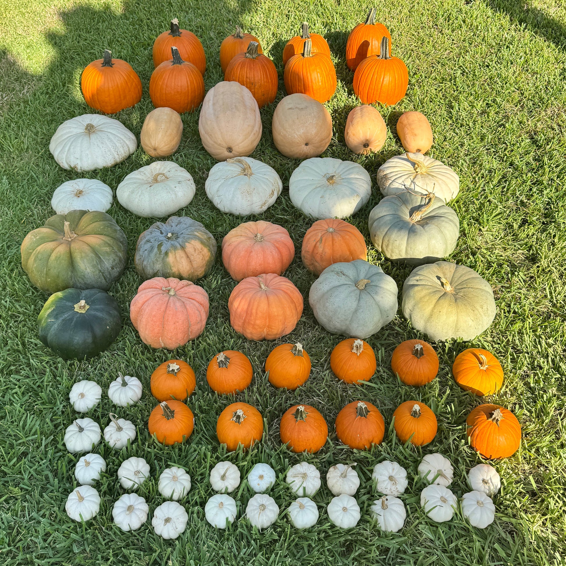 Mix of approximately 30 pumpkins including Specialty Heirloom Pumpkins in shades of white, pinks, greens, orange, and tans and traditional jack o lantern pumpkins, an assortment of Pie Pumpkins, and an abundance of mini white pumpkins. This package is great for a medium size porch or business or store front or entrance.