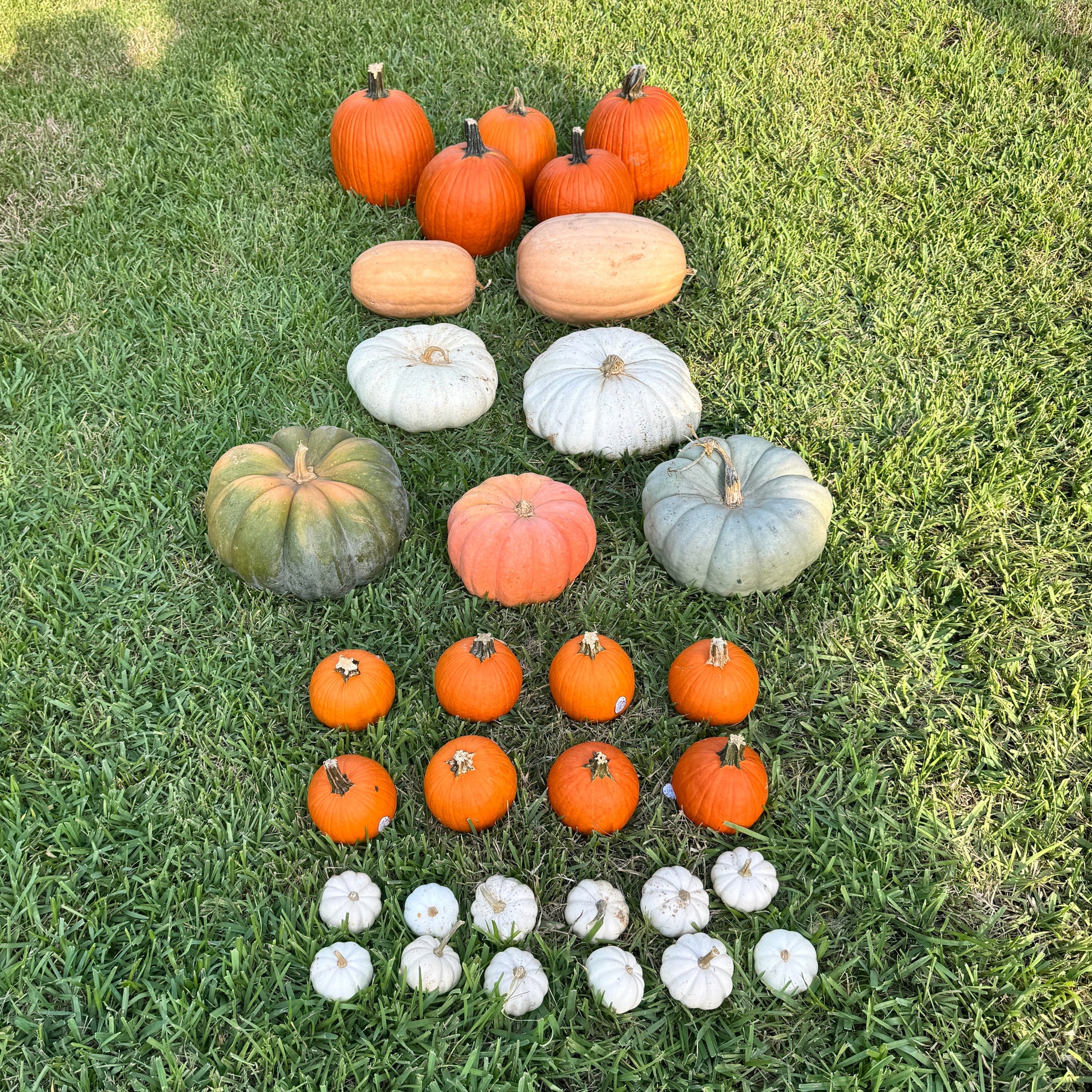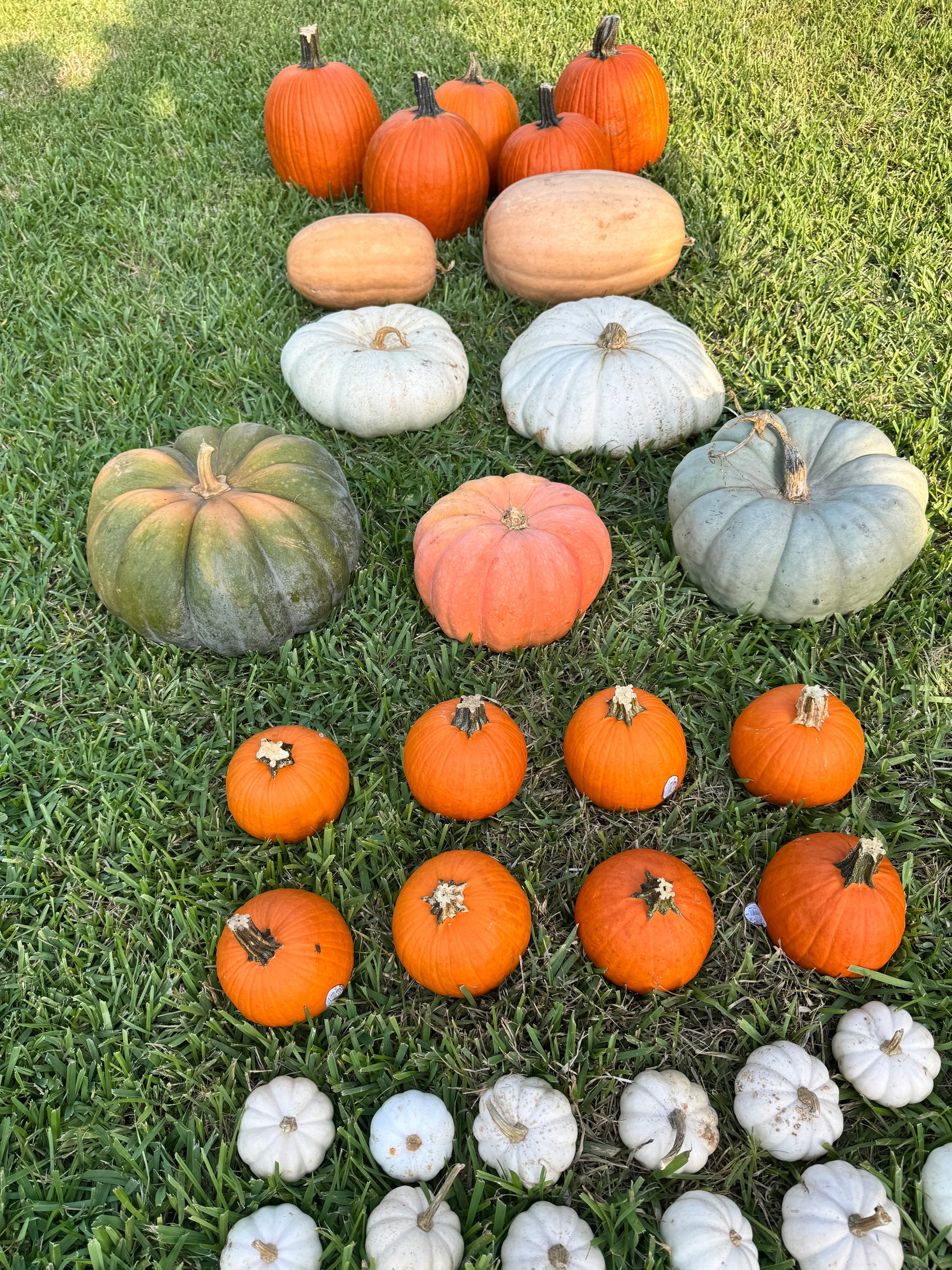 We carefully choose and curate pumpkins that tend to hold up better in South Florida's heat and humidity. This is why we use specialty heirloom pumpkins in shades of white, pink, orange-pink, tan, and sage green in addition to traditional orange pumpkins.